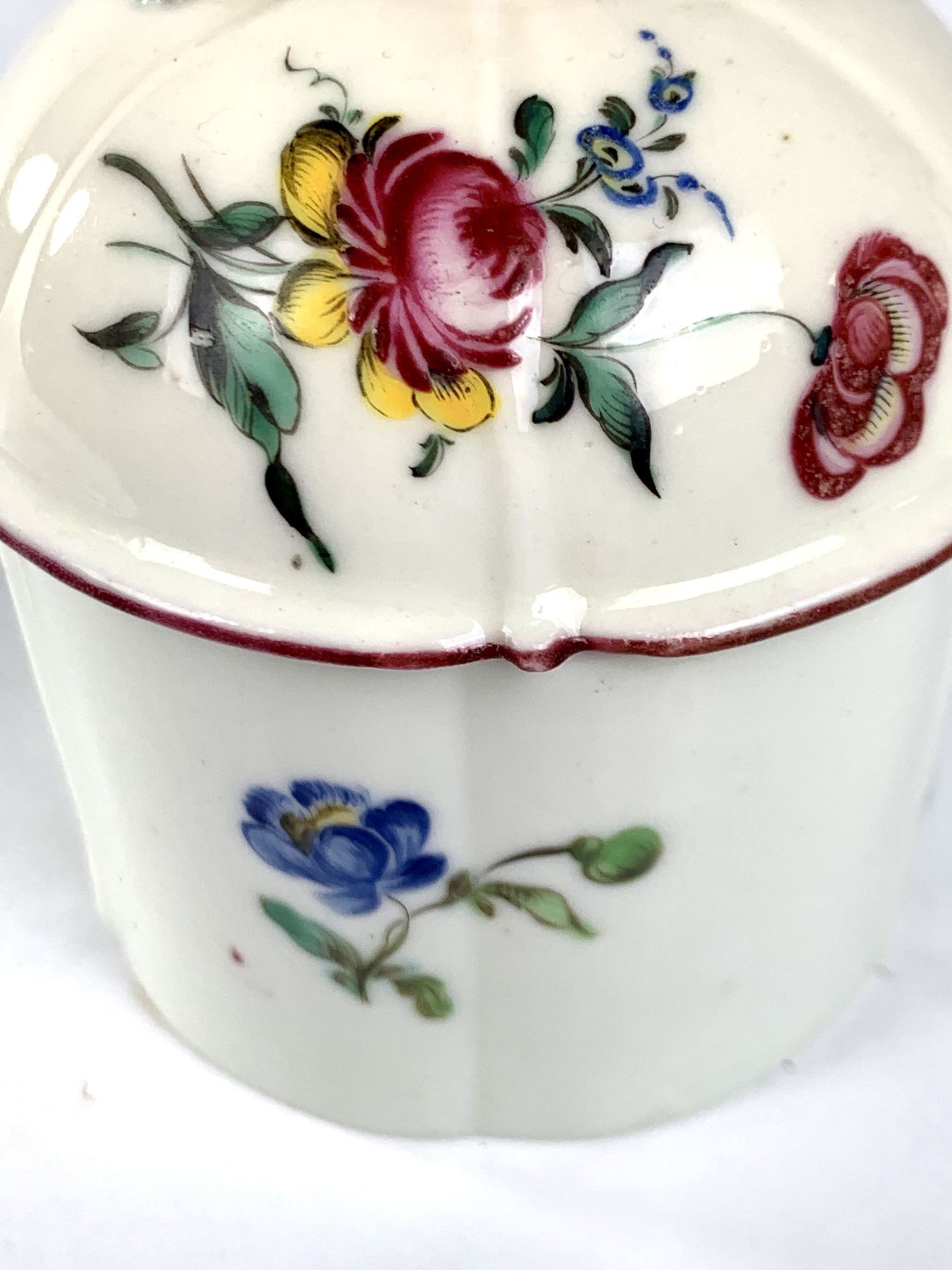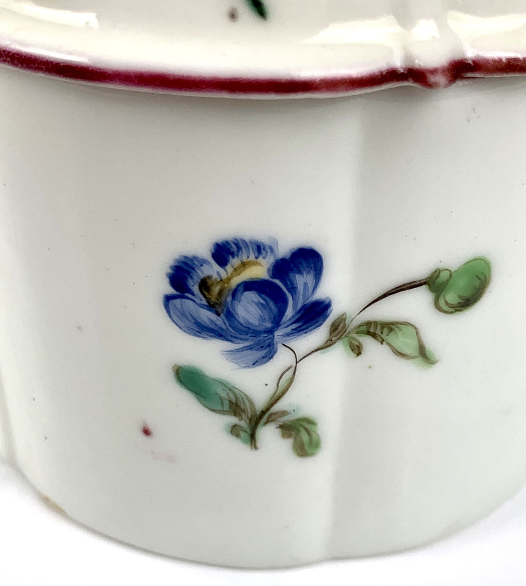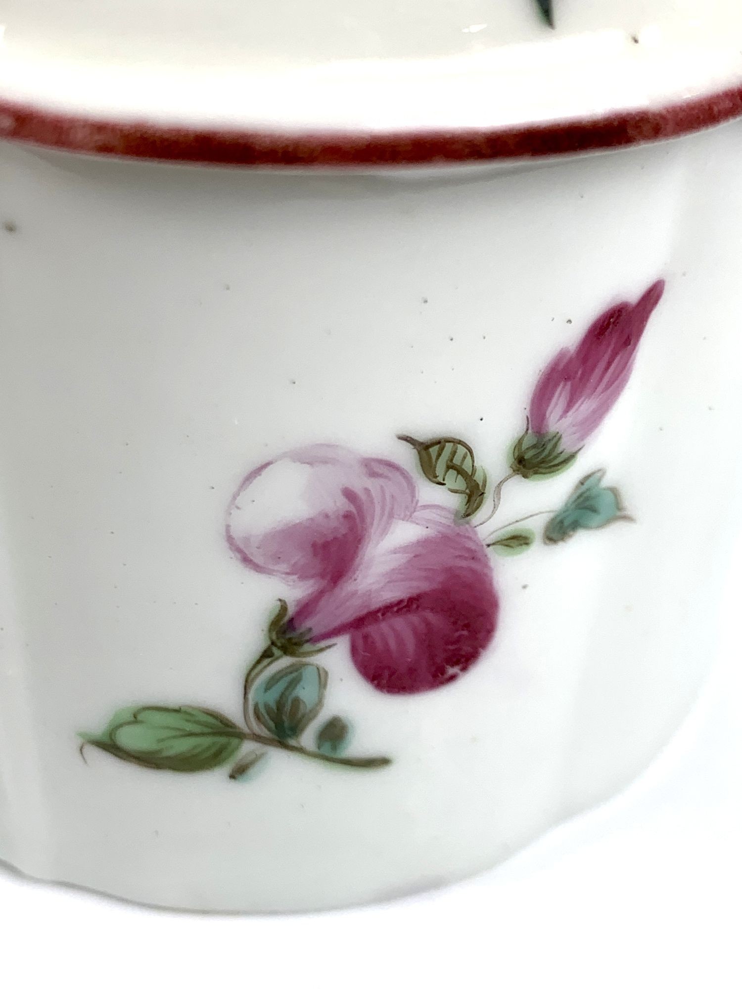 The Mennecy Porcelain Manufactory was one of the first French porcelain factories. From 1735 until 1773, the factory produced fine quality soft-paste porcelain wares. French soft-paste porcelains date to the early attempts by European potters to replicate Chinese porcelain by using mixtures of clay and glass frit. Like our pot, the body of the early Mennecy soft-paste wares has a creamy tone. There was no gilding at Mennecy. Instead, like our pot, the rims were painted in tones of pink and purple.