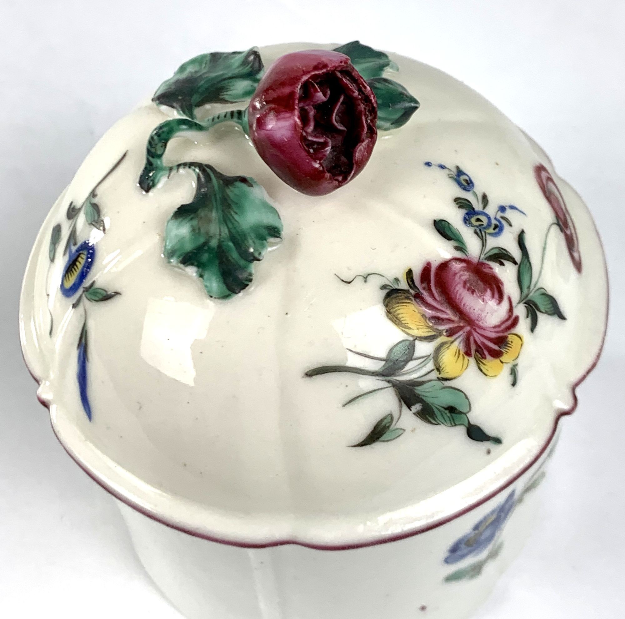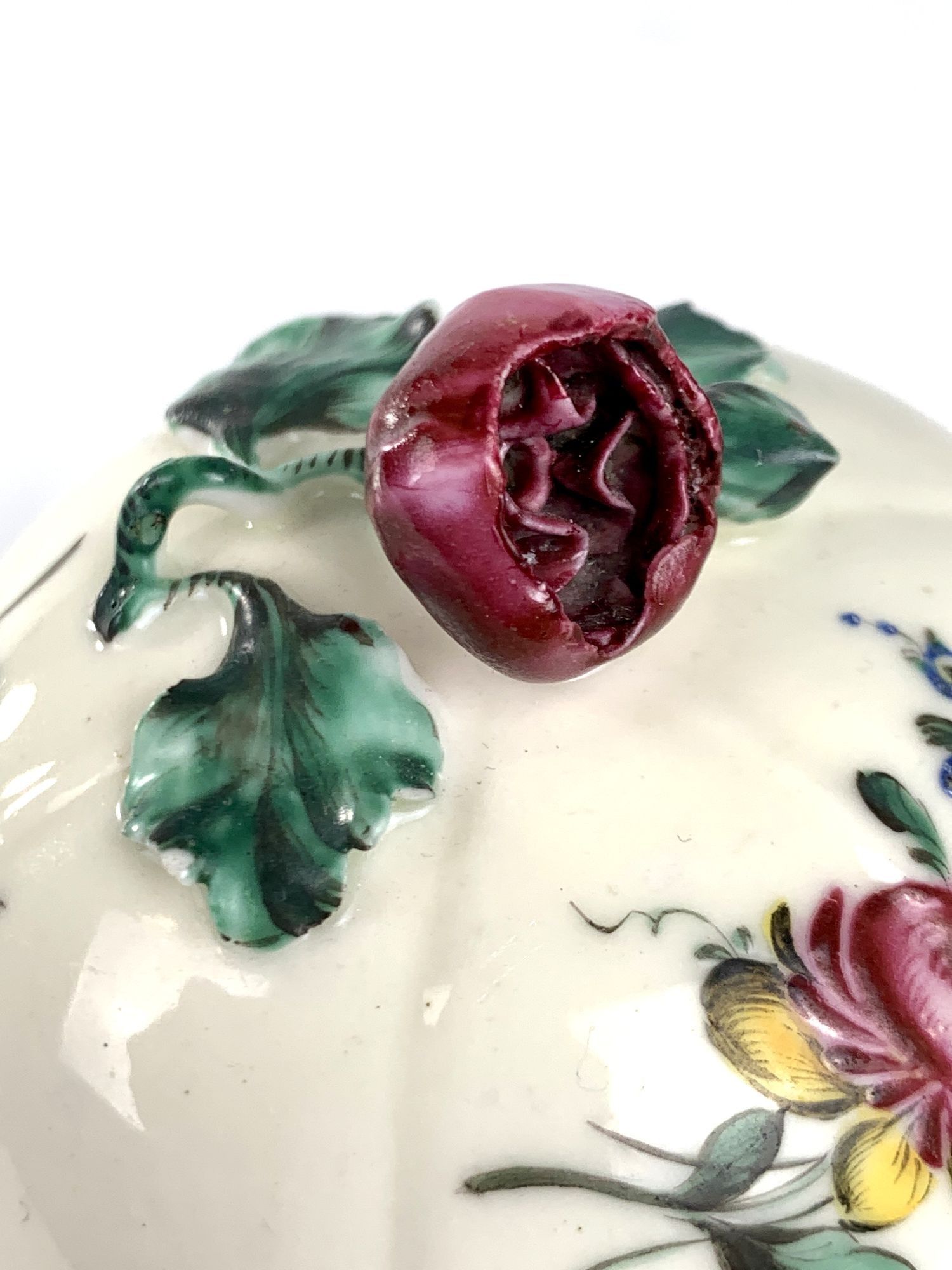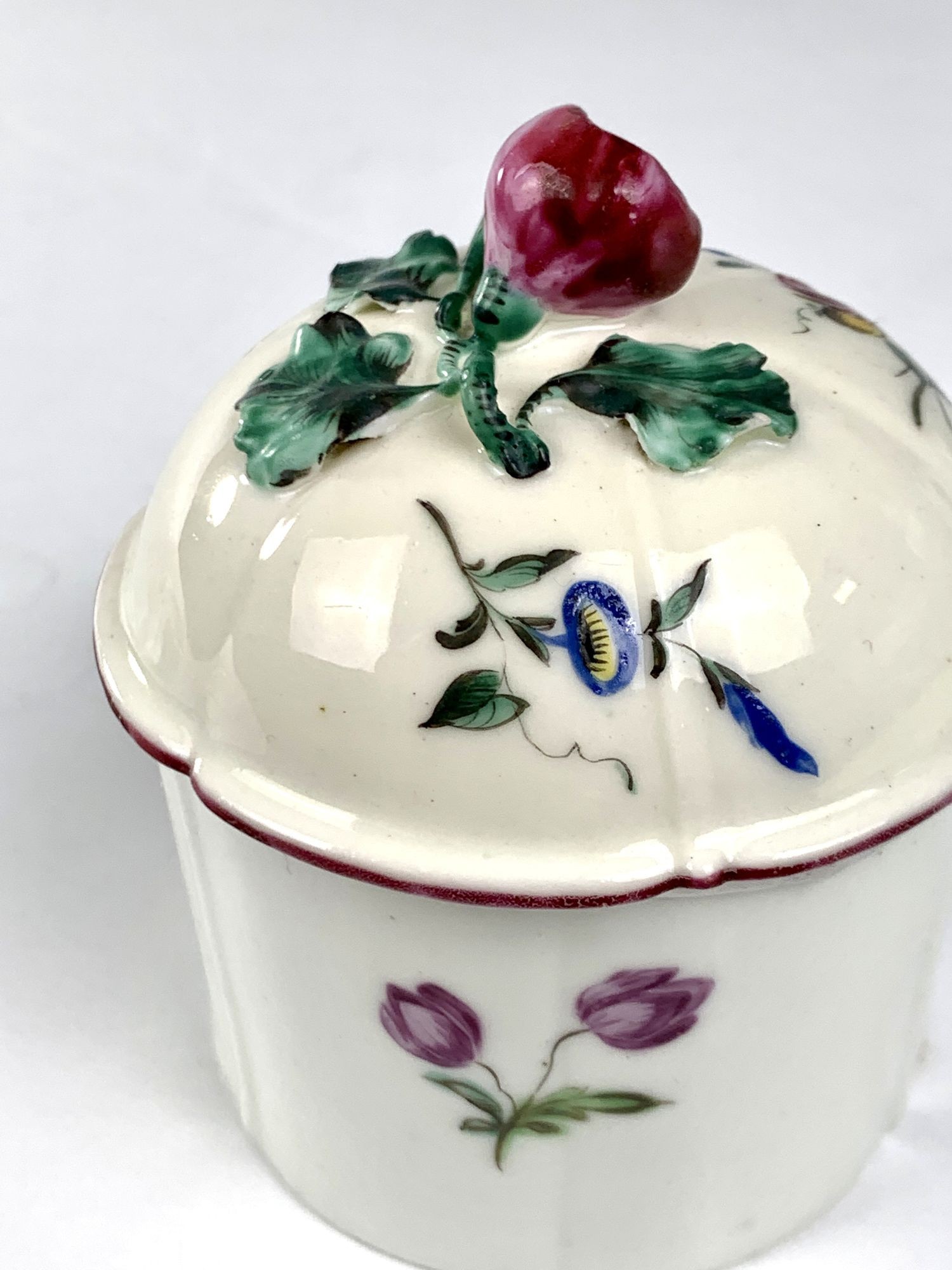 This beautiful Mennecy blush pot, ‘Pot à Fard,’ was made in France circa 1750. It is decorated with sprays of flowers, the finial shaped as a single purple rose with green leaves. The flowers are hand-painted in rich enamel colors, among them the distinctive Mennecy purple-rose hue. Another color associated with Mennecy is the most beautiful green found on the raised leaves of the rose finial and the leaves surrounding the flowers. This pot is particularly appealing because the painting of the flowers is so robust.