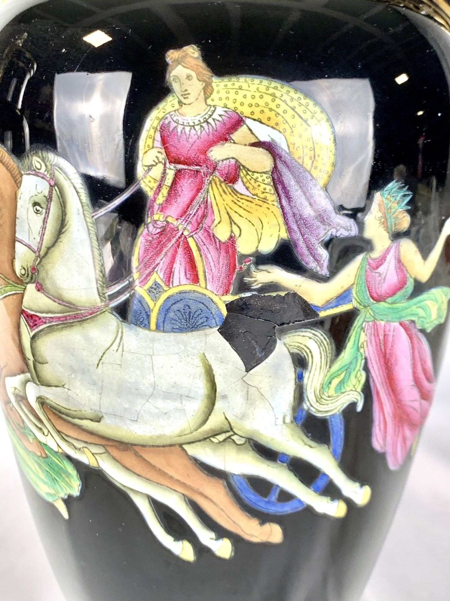 This pair of black pottery vases with Zeus and Hera chariots fit perfectly into the Victorian fascination with classical mythology and decorative porcelain.