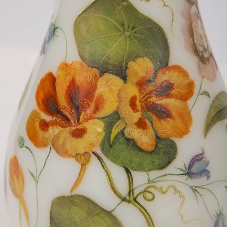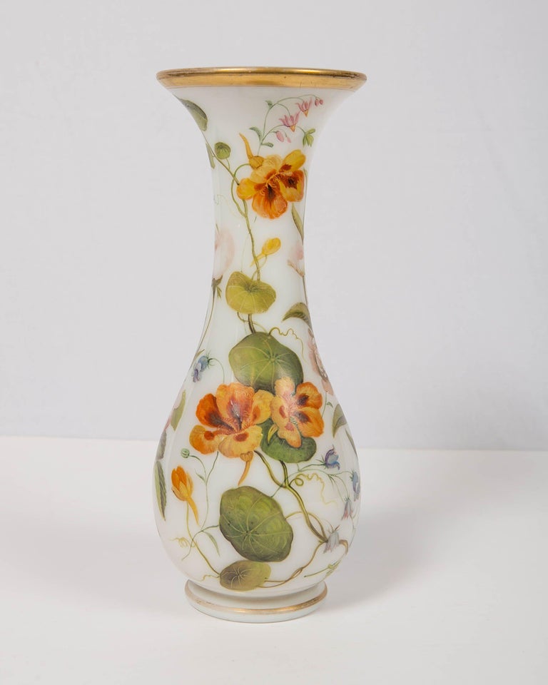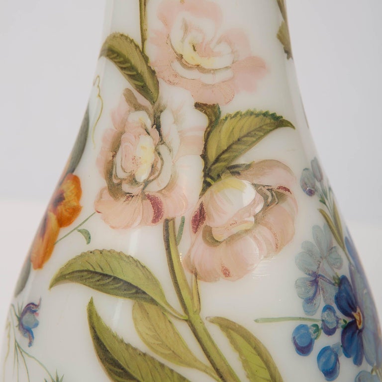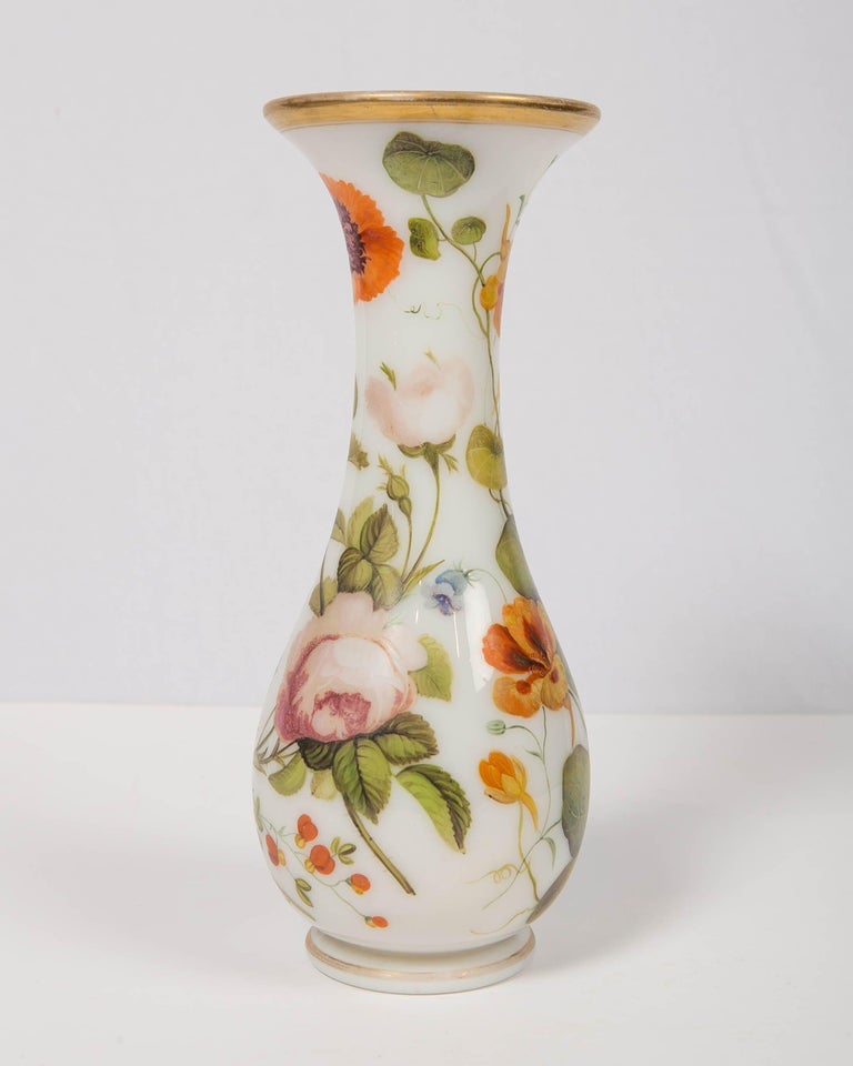 Large French Opaline Vase Hand Blown & Hand Painted with Flowers C. 1840